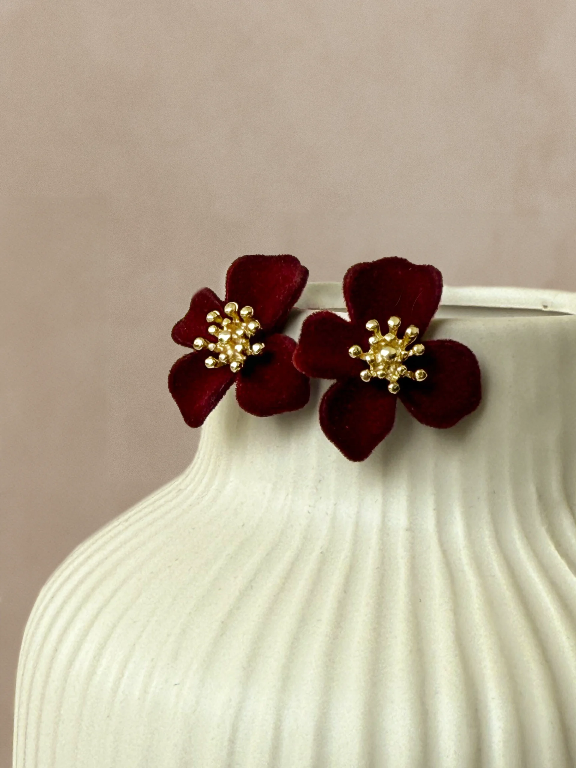 Delikatne kobiece kolczyki w kształcie kwiatków. Czerwone płatki ze złotą oprawą.