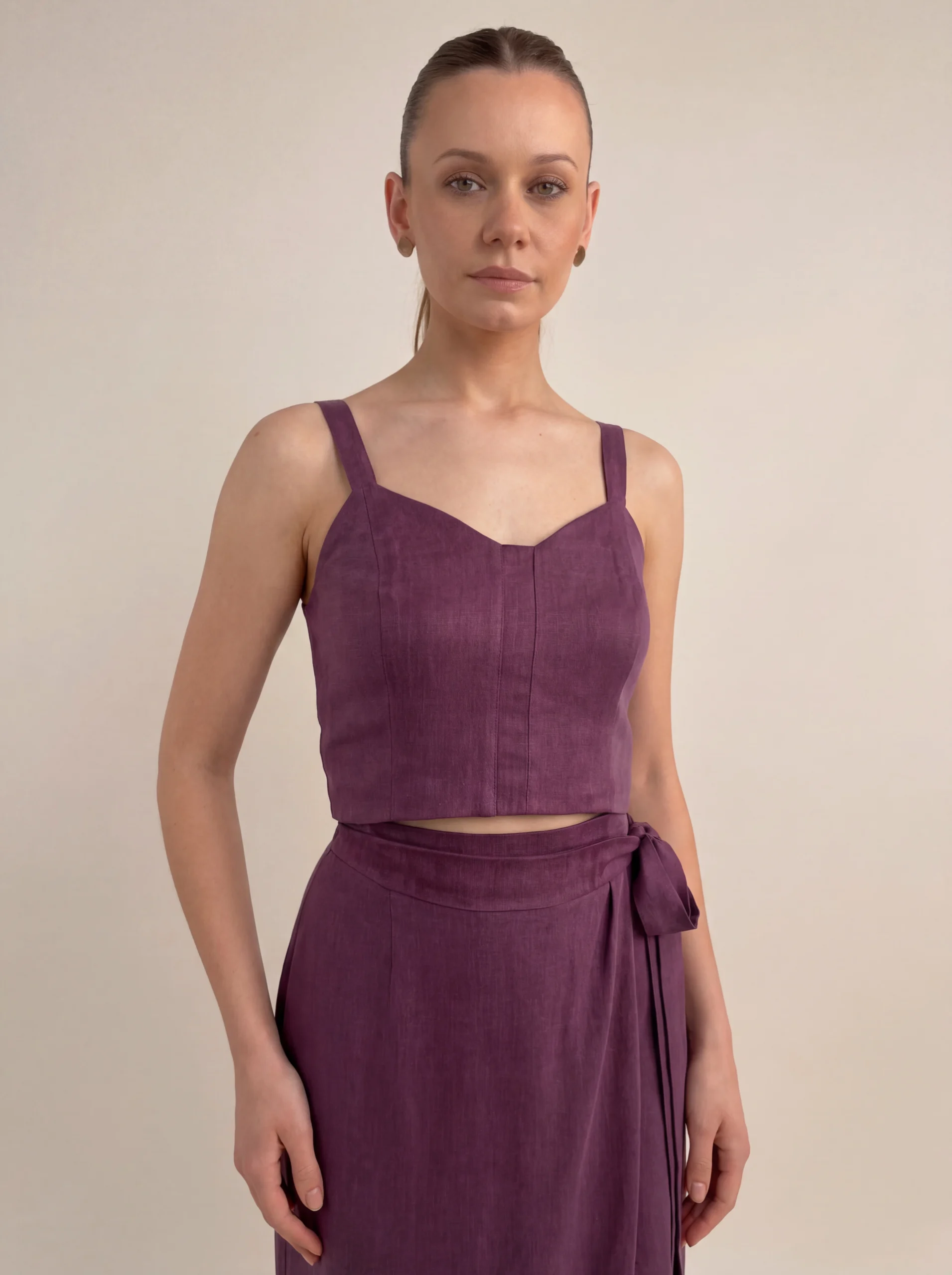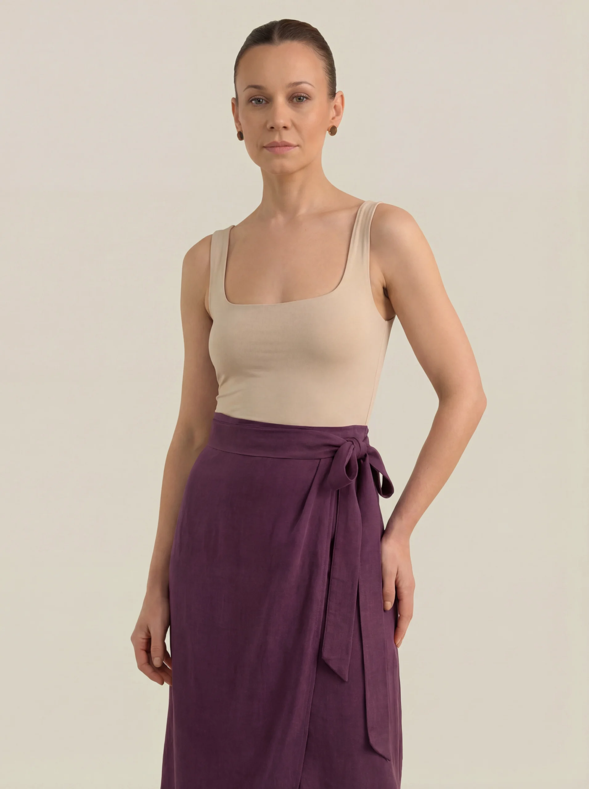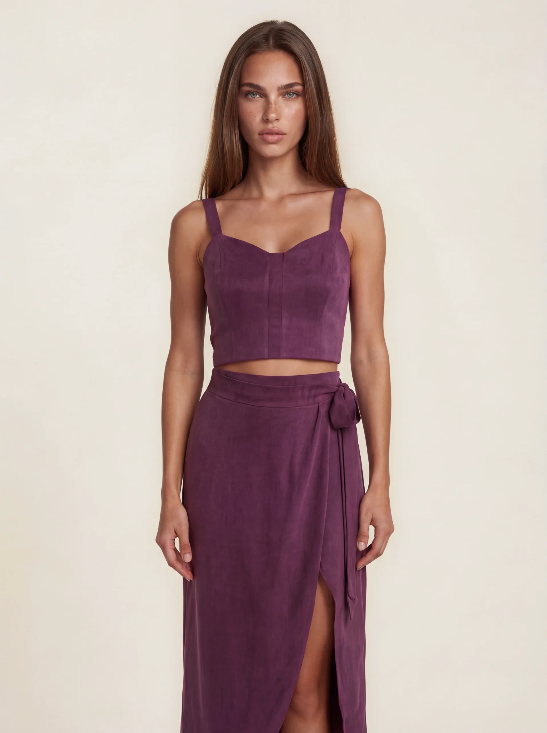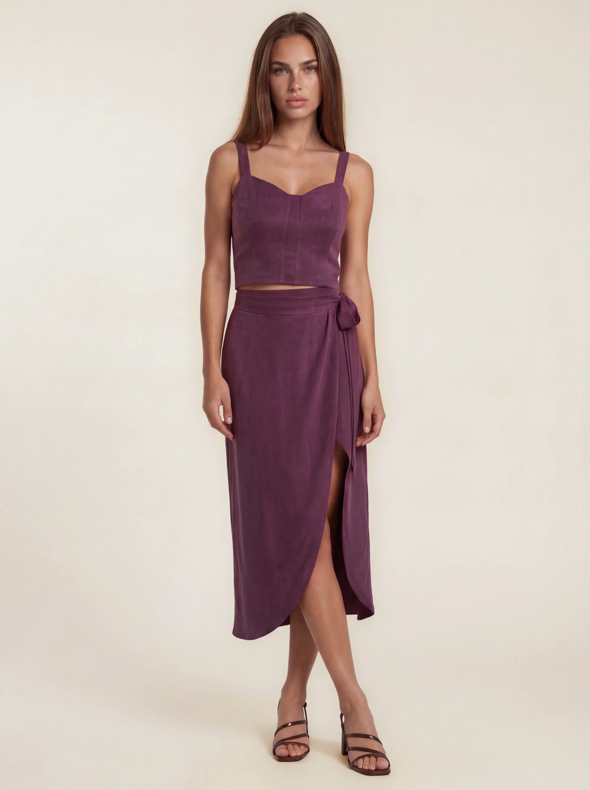 Éclat to spódnica o charakterystycznym kopertowym kroju, która przyciąga uwagę głębokim, nasyconym kolorem. Asymetryczna linia i wiązanie w talii podkreślają sylwetkę, tworząc elegancką, nowoczesną formę.
