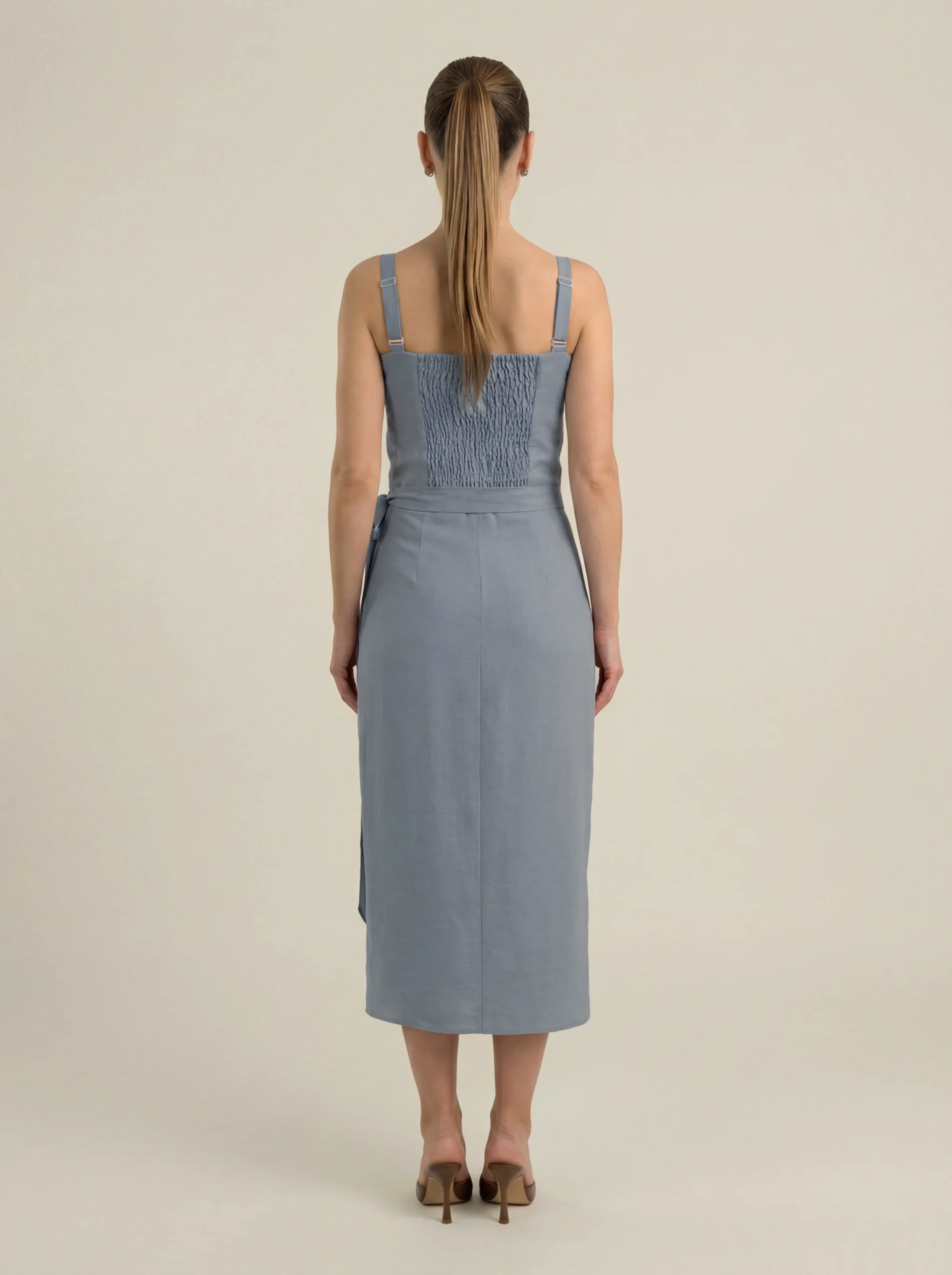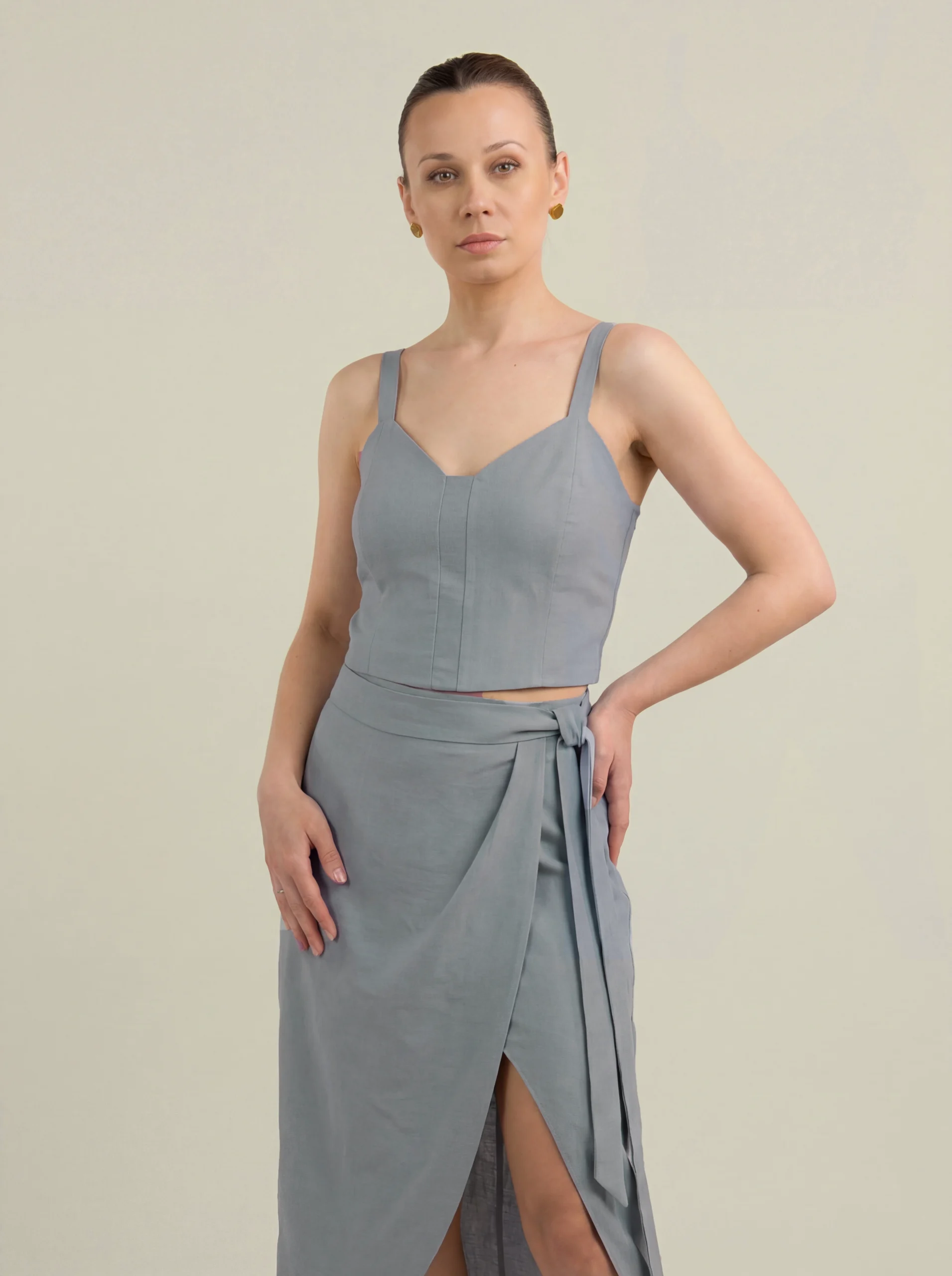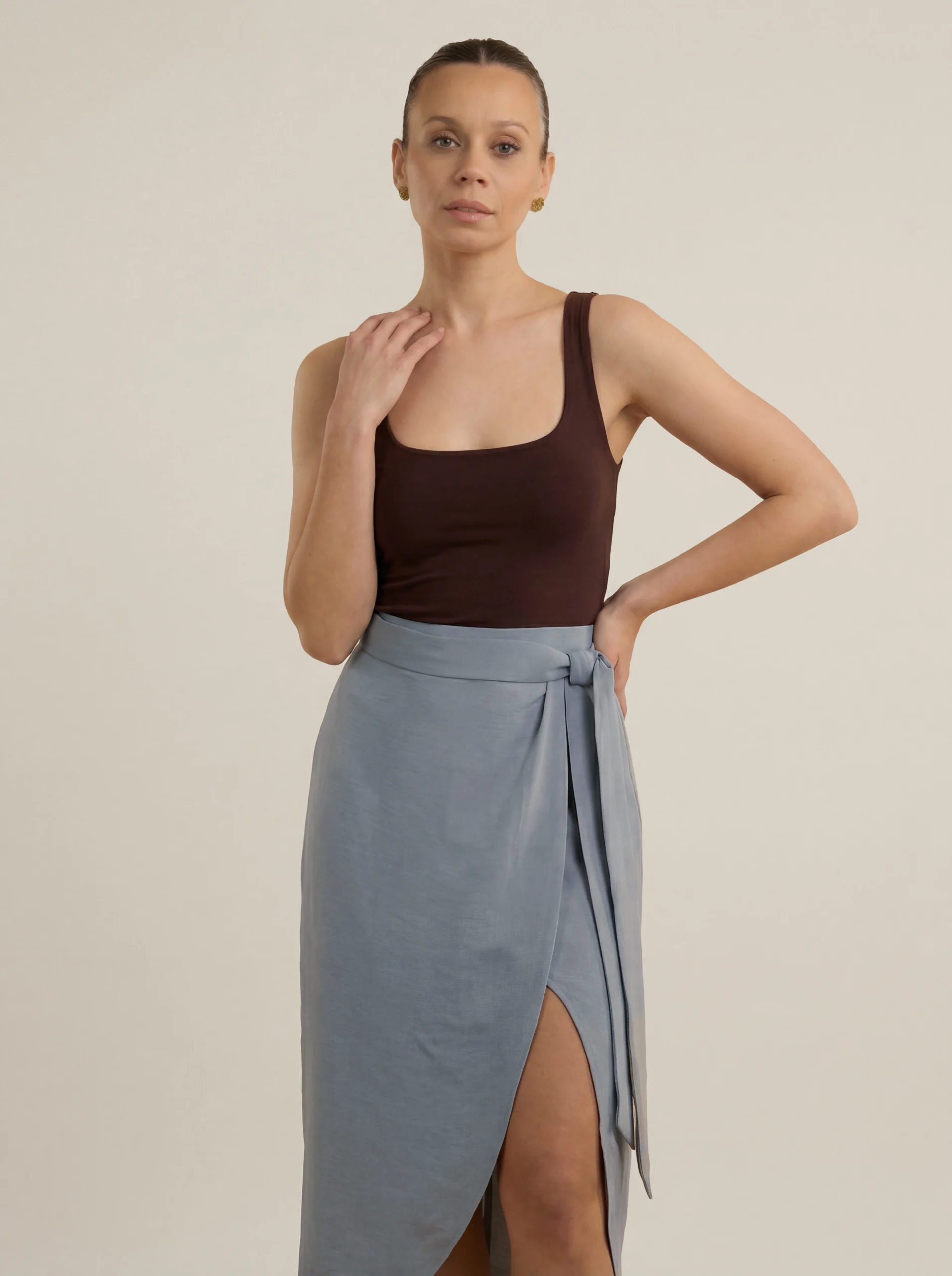 Muse Ciel to wiskozowa spódnica kopertowa, która łączy minimalistyczną formę z kobiecą lekkością. Asymetryczny krój i wiązanie w talii podkreślają proporcje sylwetki, nadając jej eleganckiej, naturalnej linii.