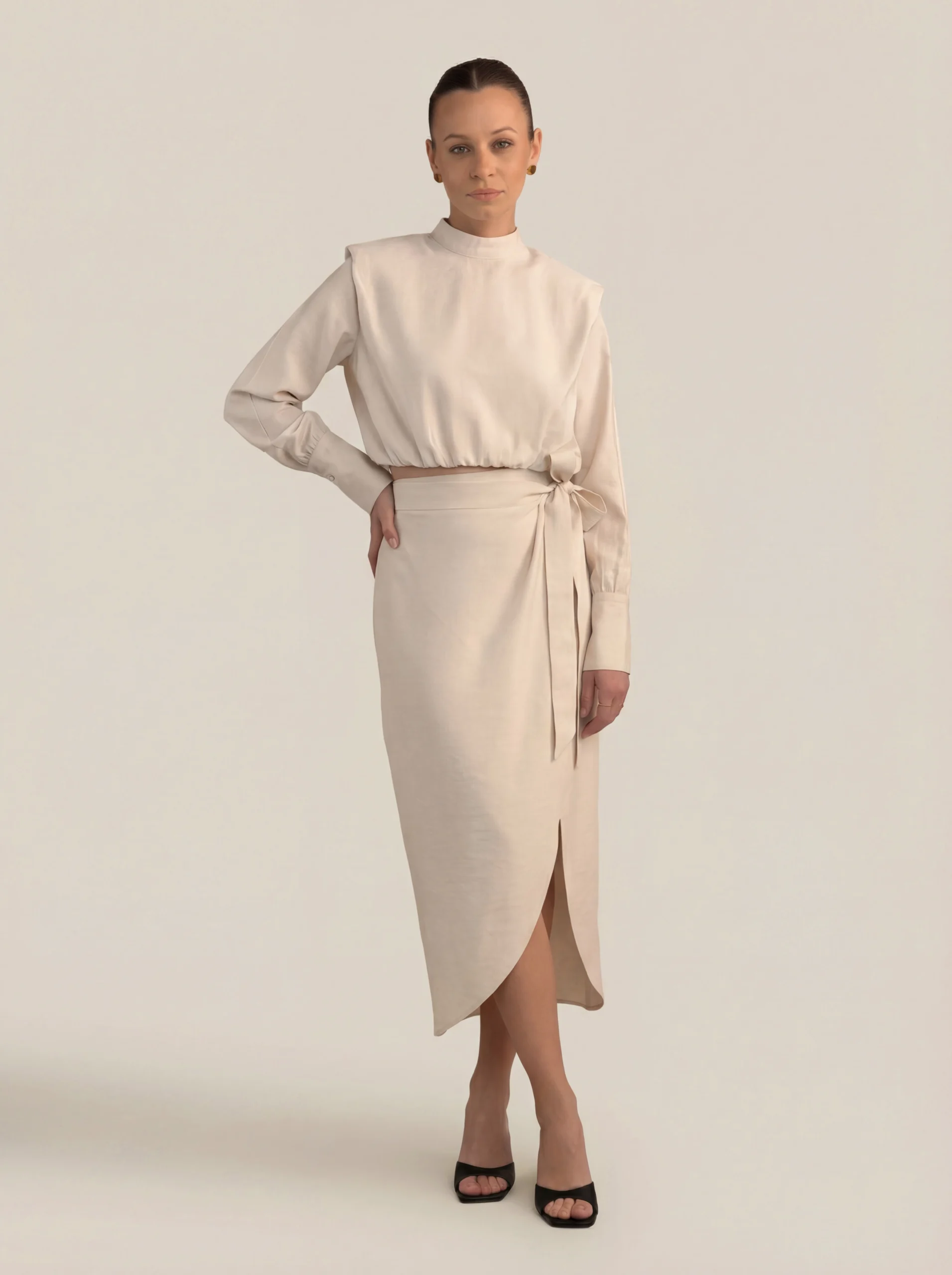 Muse Crème to wiskozowa spódnica kopertowa, która łączy minimalistyczną formę z kobiecą lekkością. Asymetryczny krój i wiązanie w talii podkreślają proporcje sylwetki, nadając jej eleganckiej, naturalnej linii.