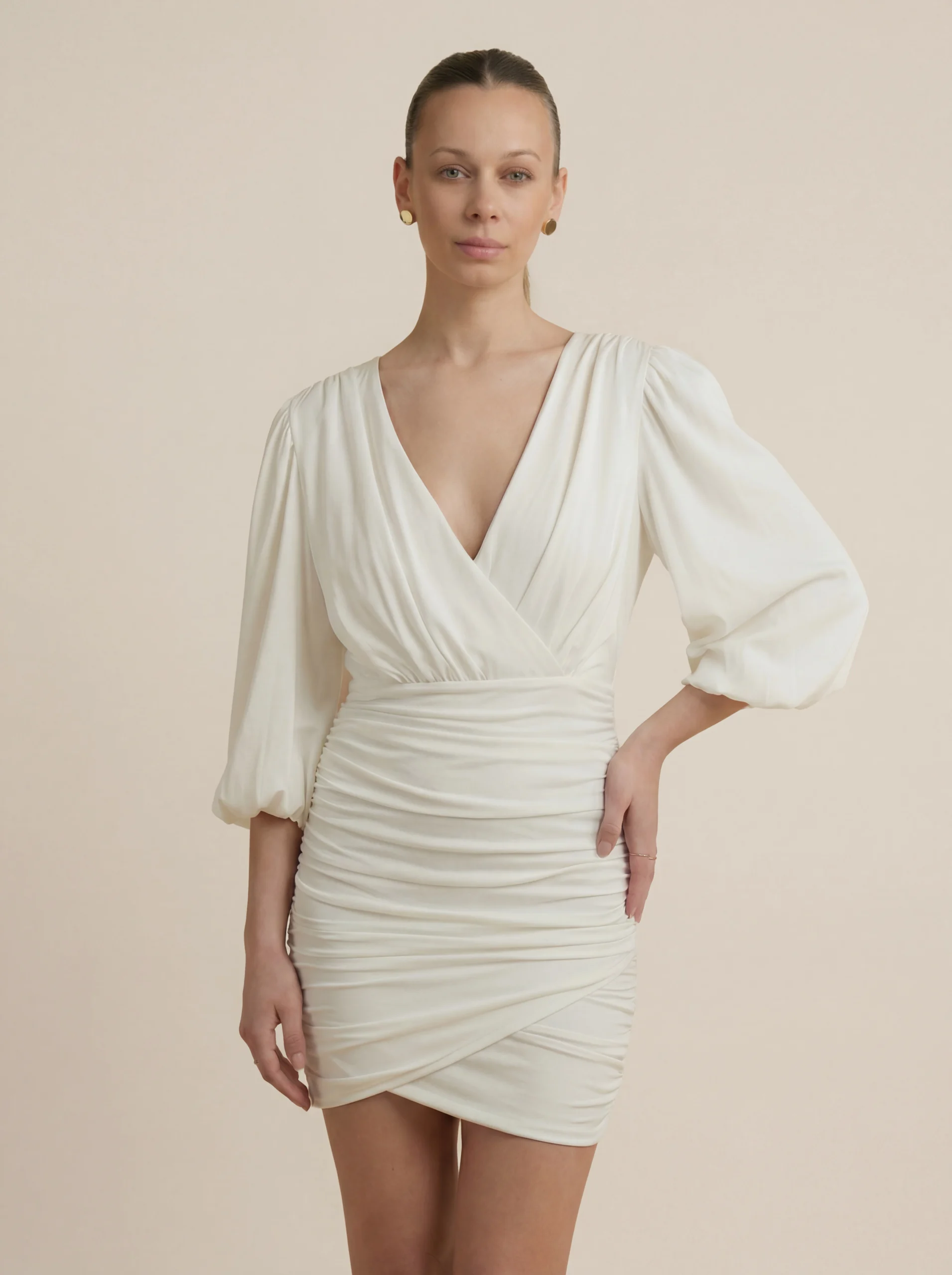 Élan to sukienka wykonana z miękkiej, elastycznej dzianiny wiskozowej, która dopasowuje się do sylwetki i podkreśla jej naturalne proporcje. Kopertowy dekolt subtelnie eksponuje linię szyi i ramion, a drapowanie w talii i na biodrach modeluje sylwetkę, tworząc efekt wysmuklenia.
