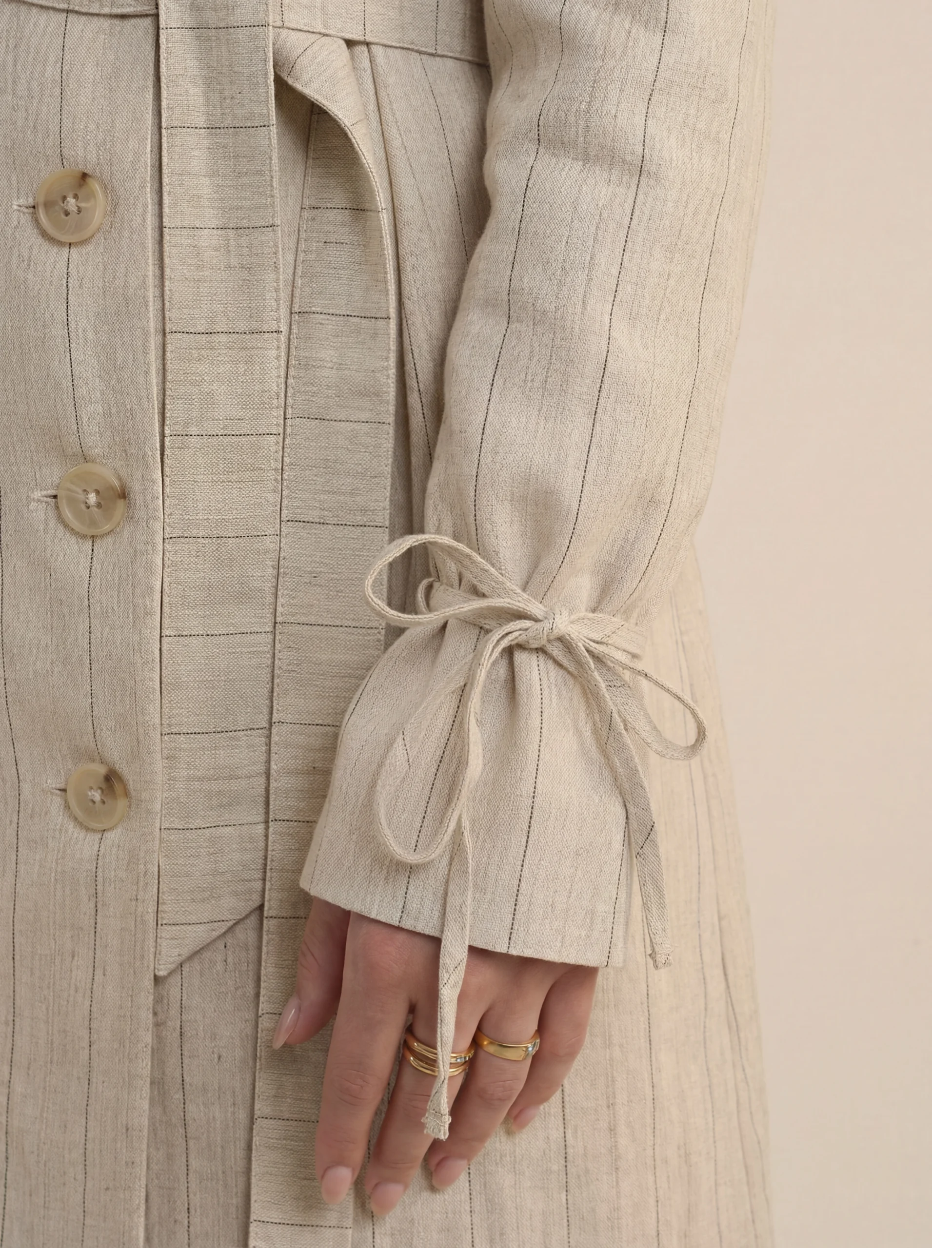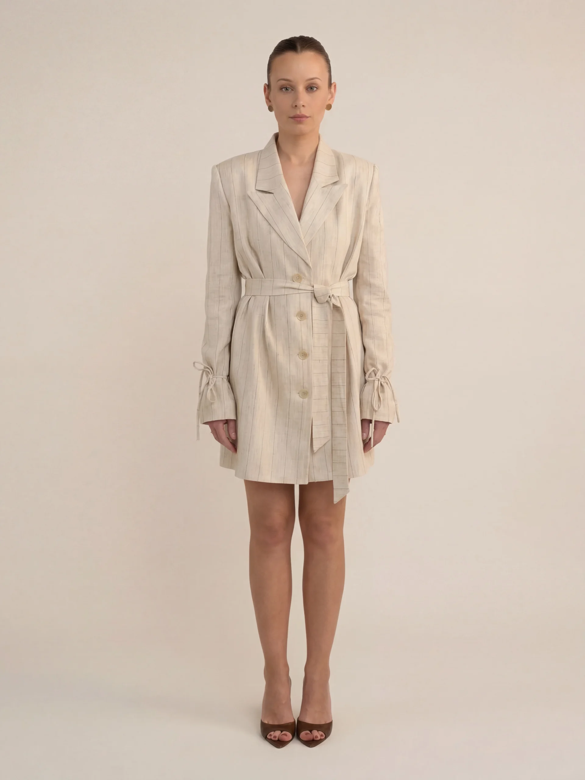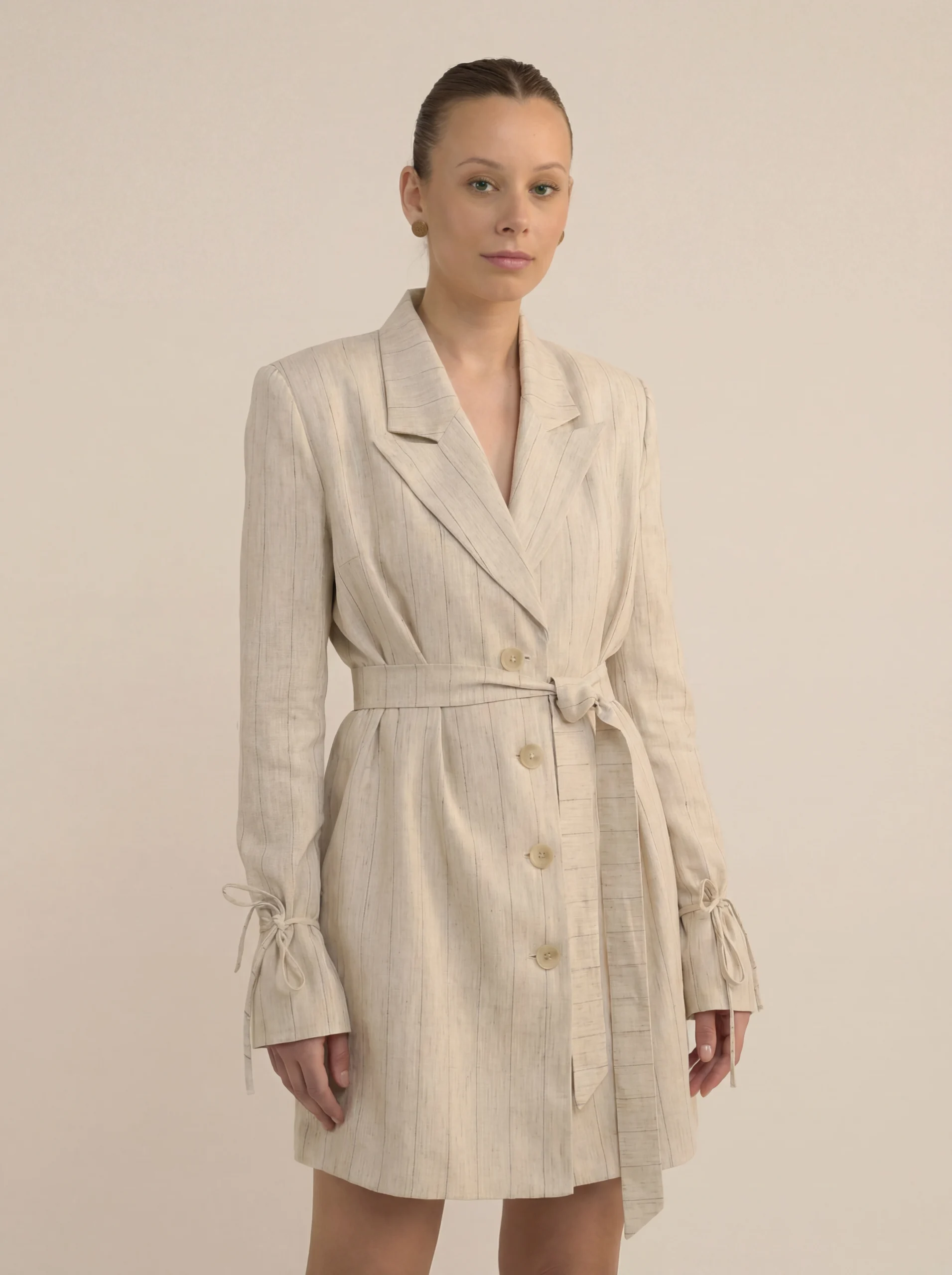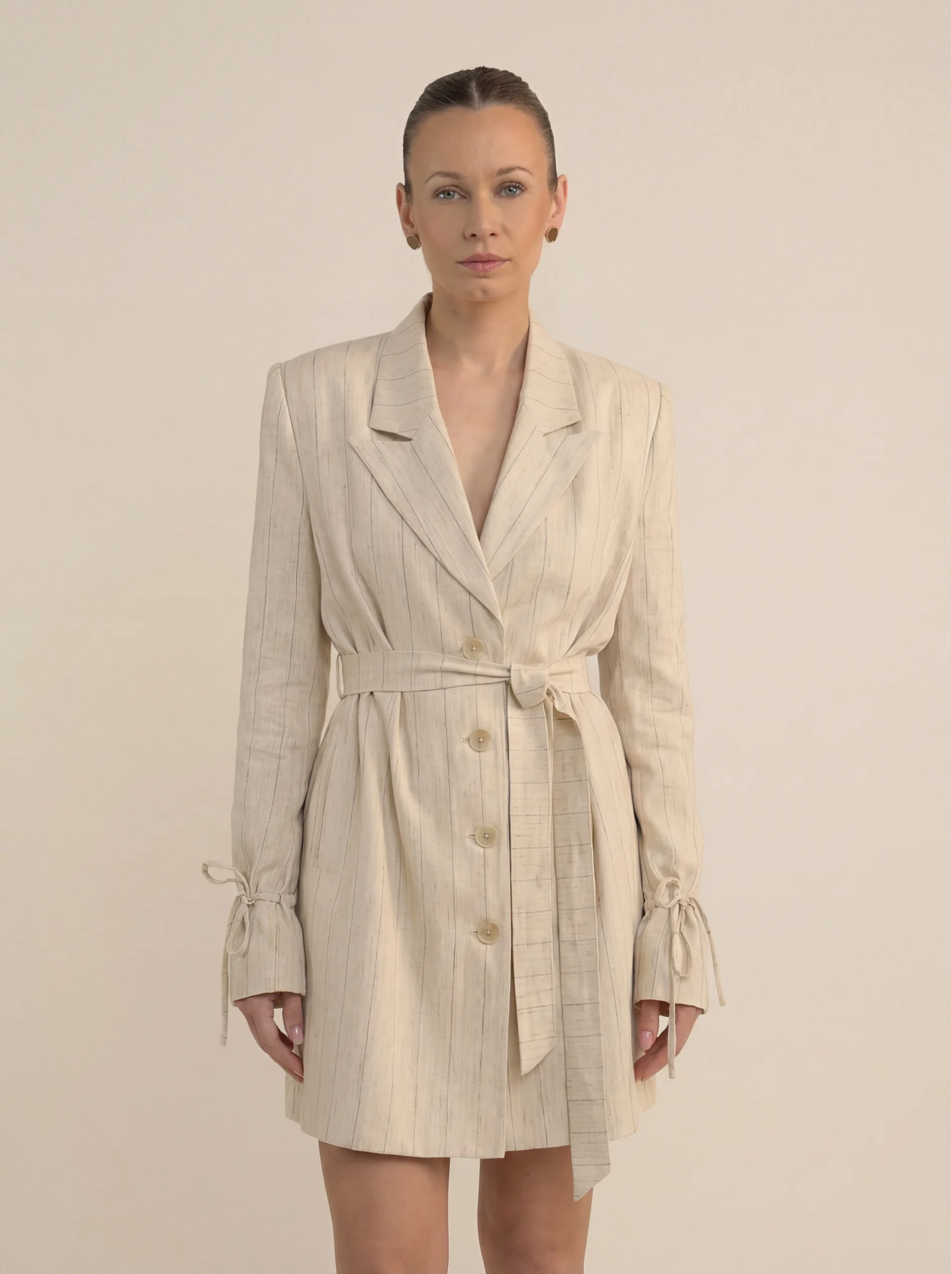 Ligne to sukienka inspirowana klasycznym krojem marynarki, która łączy elegancję tailoringu z kobiecą sylwetką. Klapy, zapięcie na guziki i pasek w talii podkreślają proporcje figury, a pionowy rysunek tkaniny optycznie wydłuża sylwetkę.