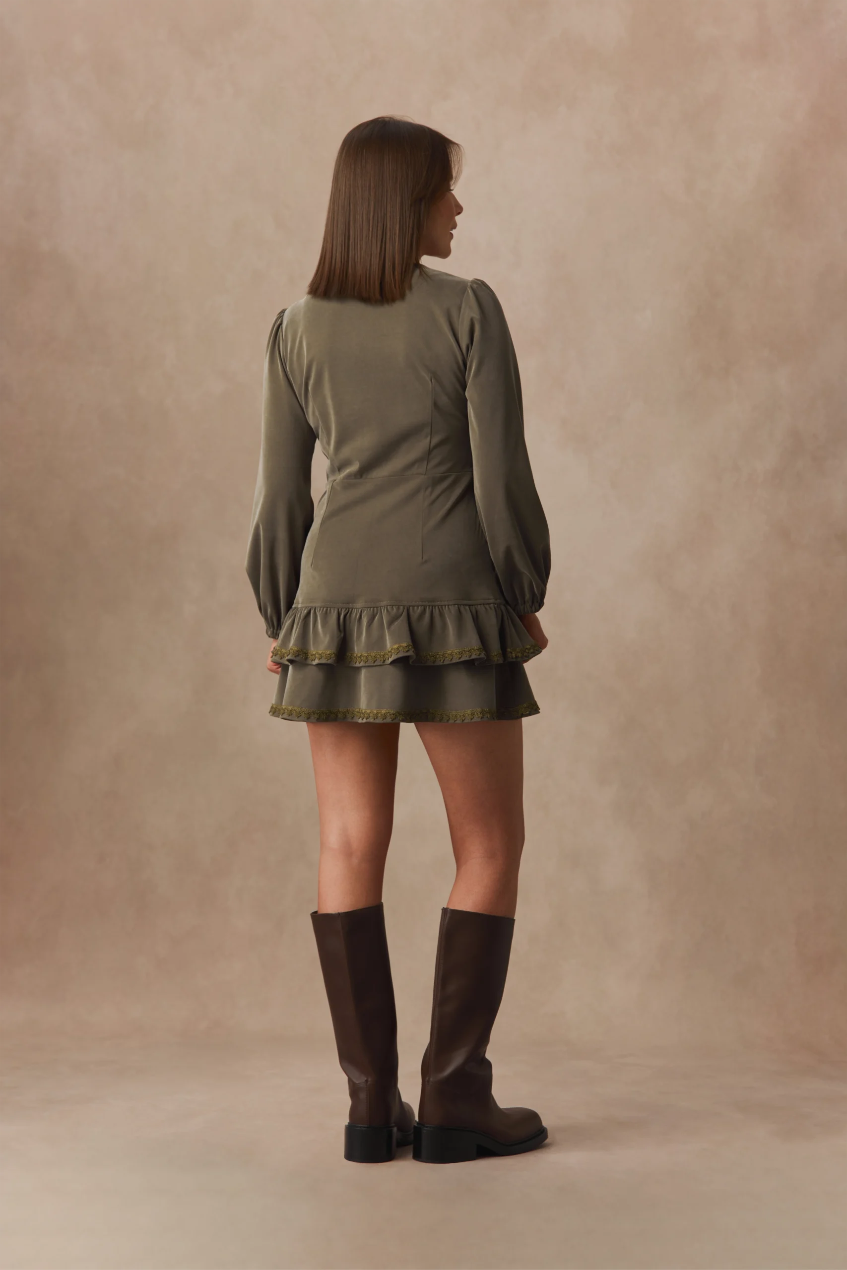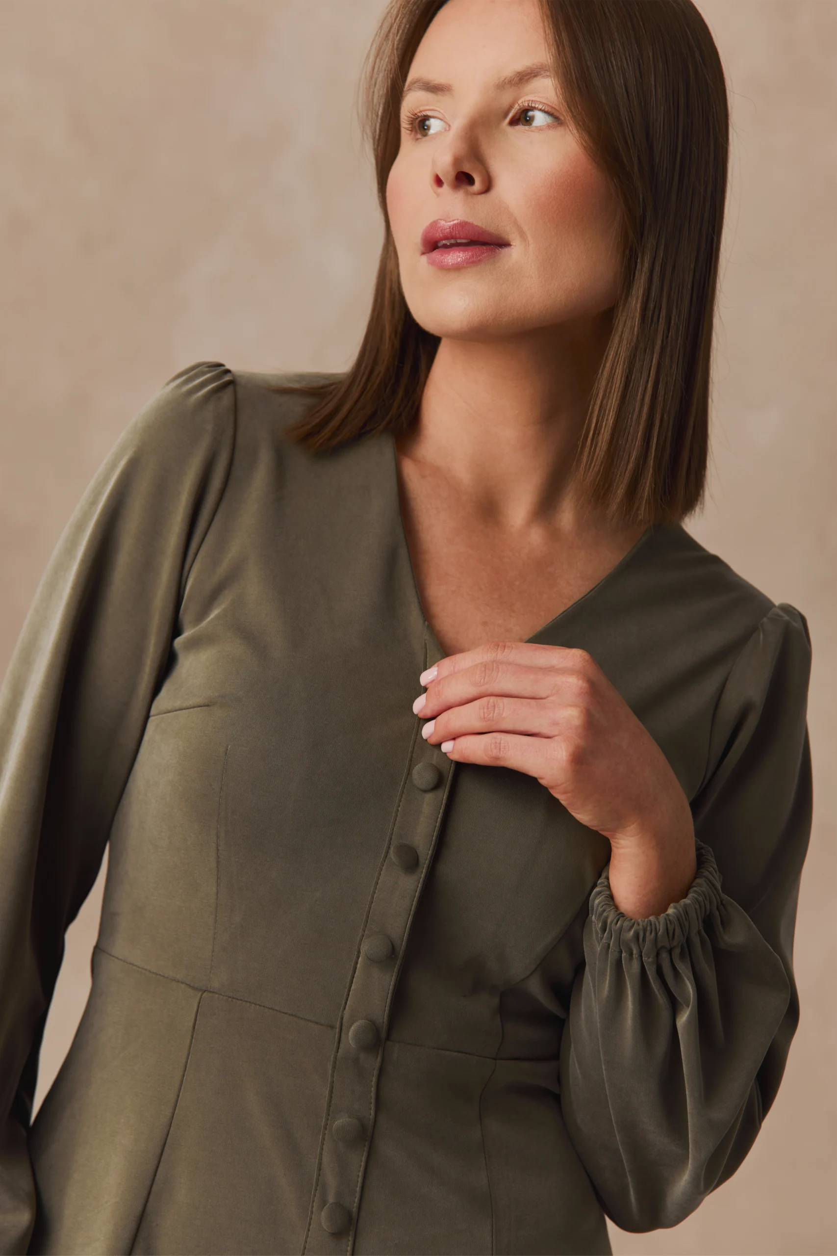 Rêve to elastyczna, mięsista sukienka z tkaniny cupro, która pięknie układa się na sylwetce i otula ciało. Ma luźny krój, marszczone rękawy zakończone gumką oraz kryty zamek z boku. Dziewczęce falbany i oblekane guziki dodają jej wdzięku, a grubsza tkanina sprawia, że idealnie sprawdza się także w chłodniejsze dni.