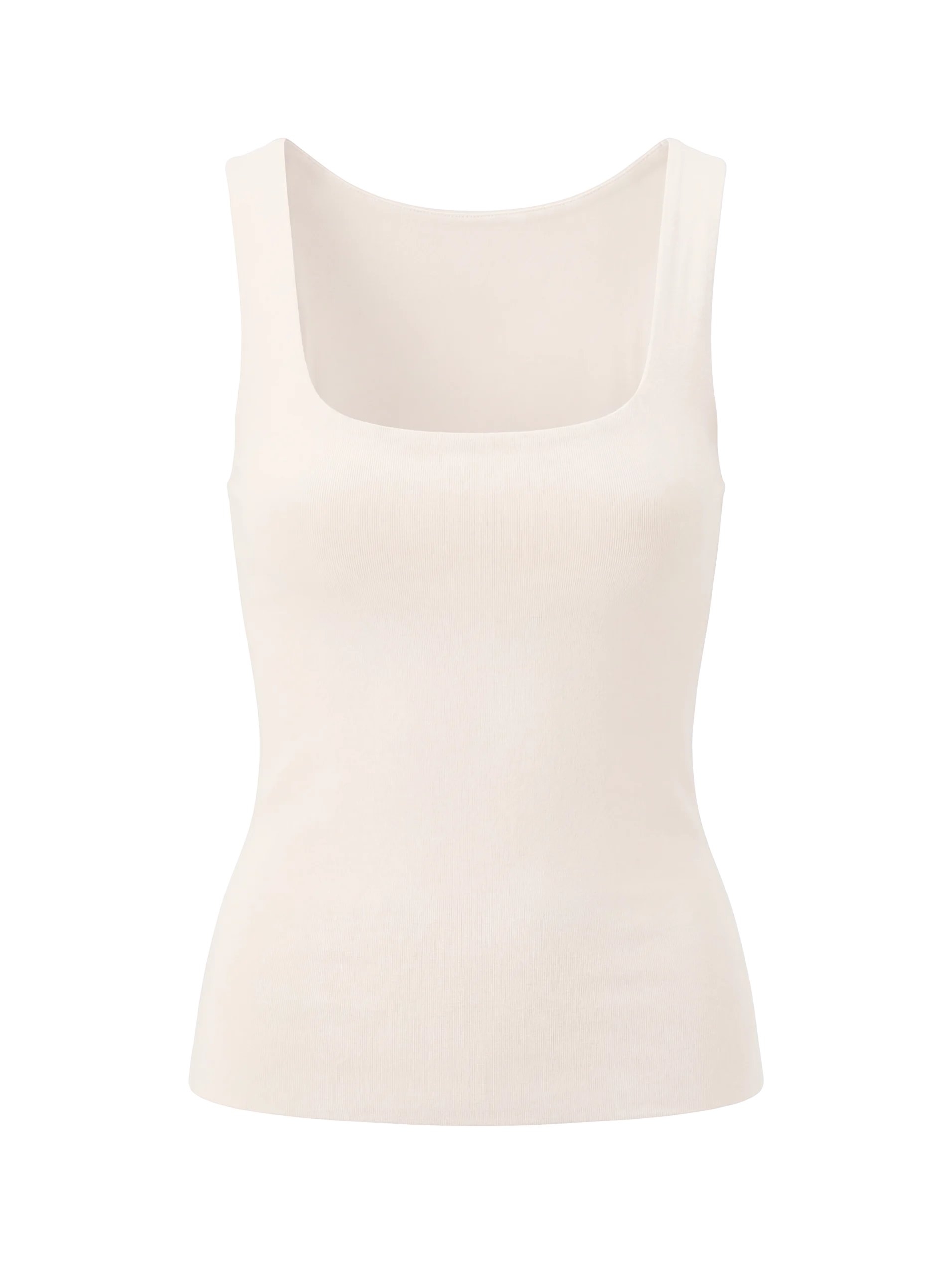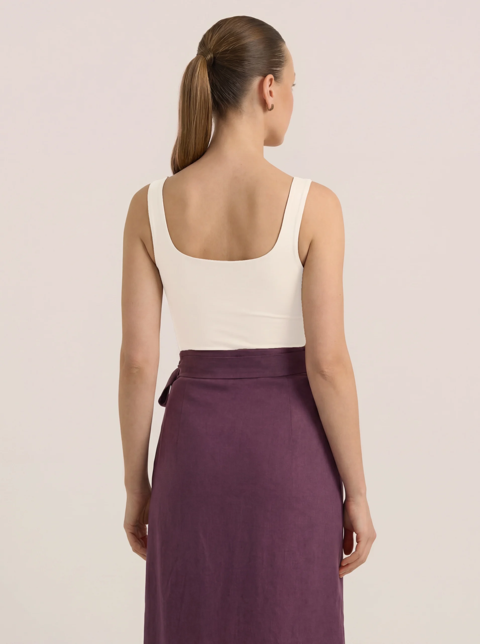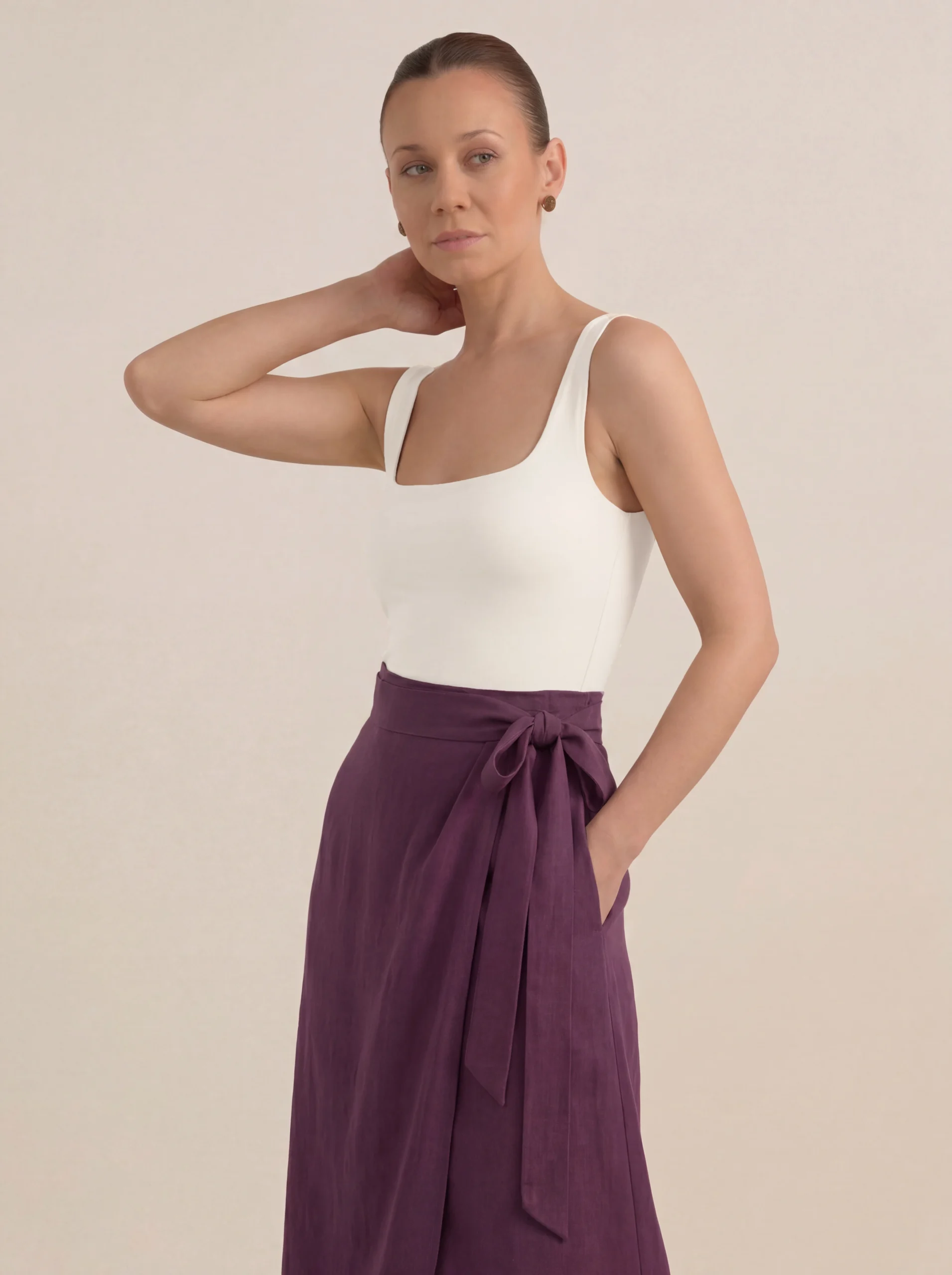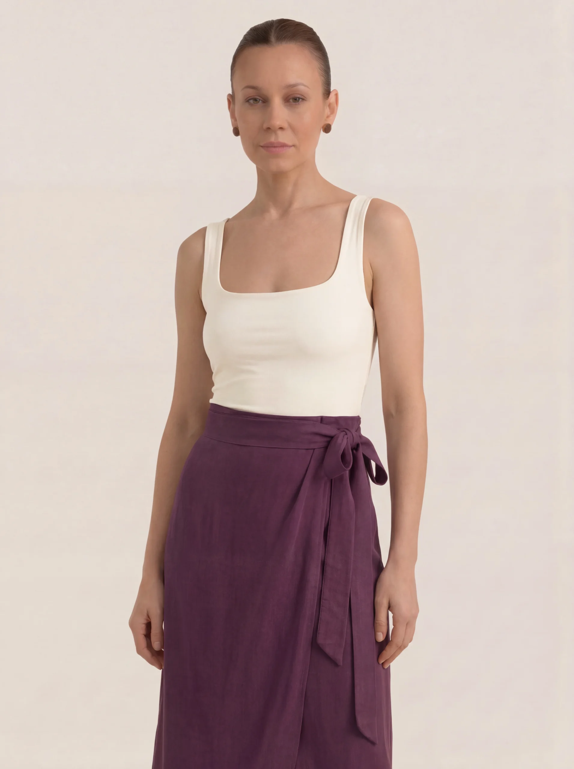 Top Duo Off WHite to dopasowany, elastyczny top z dzianiny bambusowej, stworzony z myślą o codziennym komforcie i czystej estetyce. Możesz nosić go na dwa sposoby — przodem do tyłu i tyłem do przodu — dzięki czemu jednym ruchem zmieniasz charakter dekoltu.
