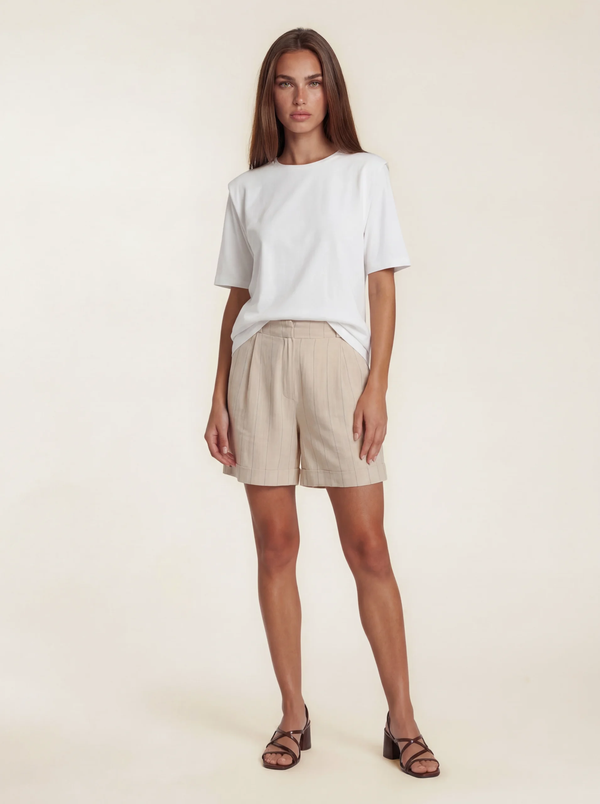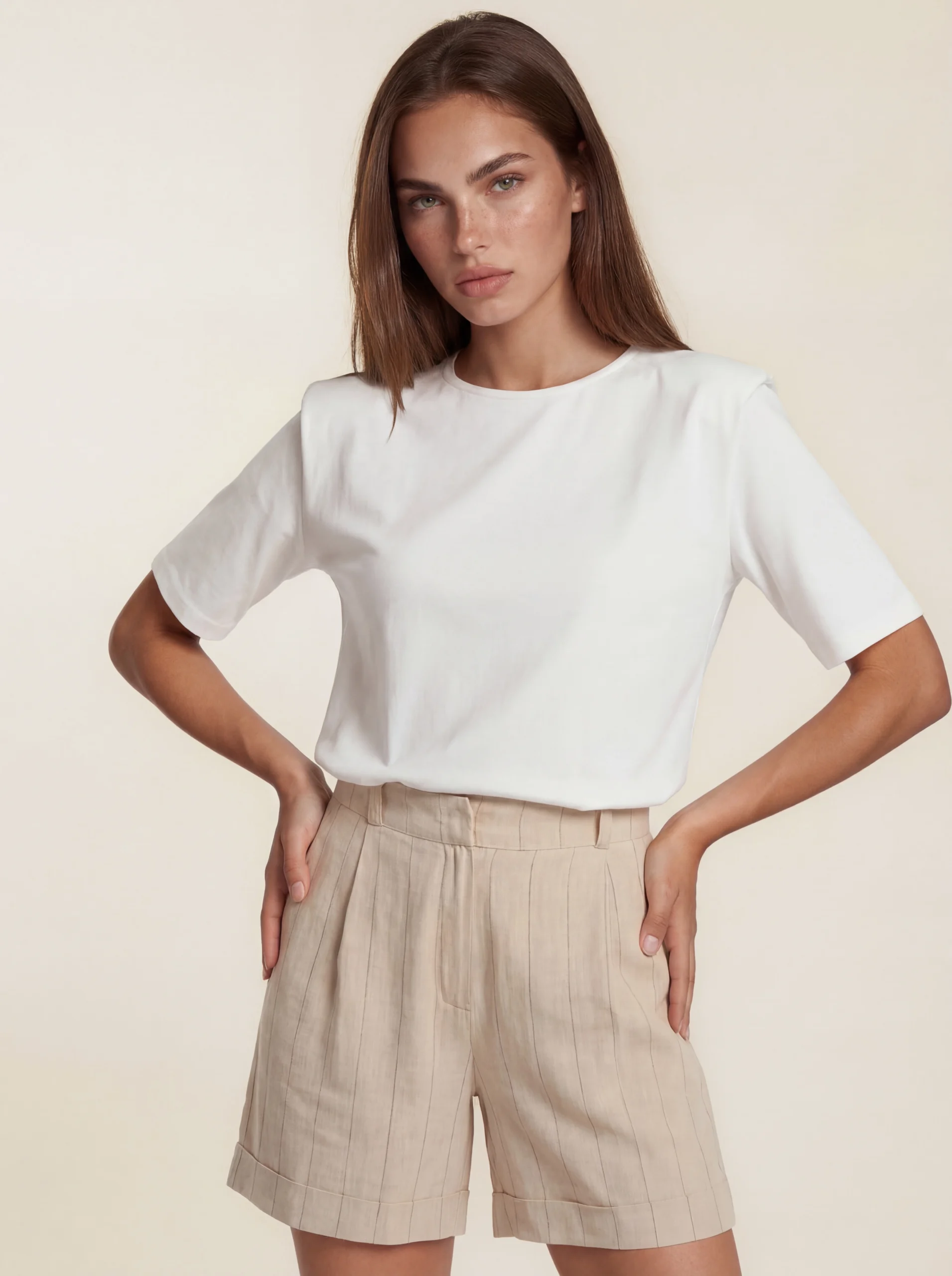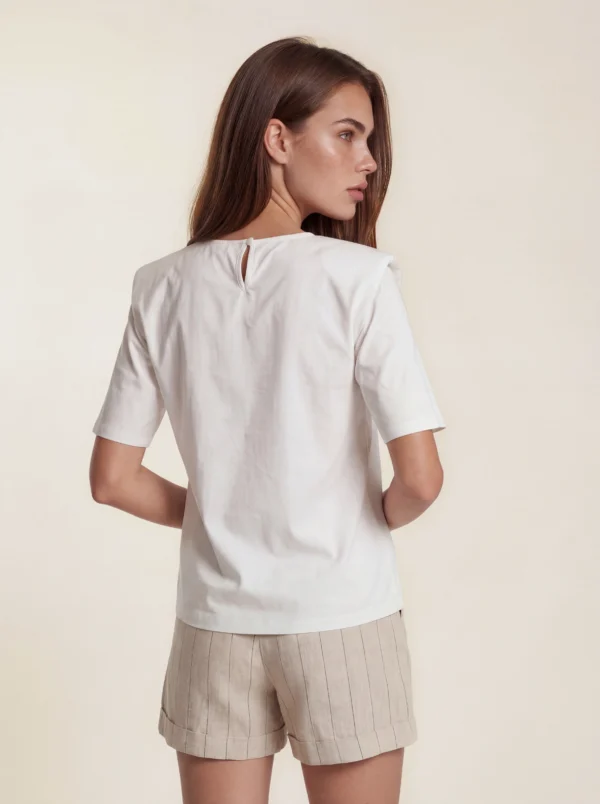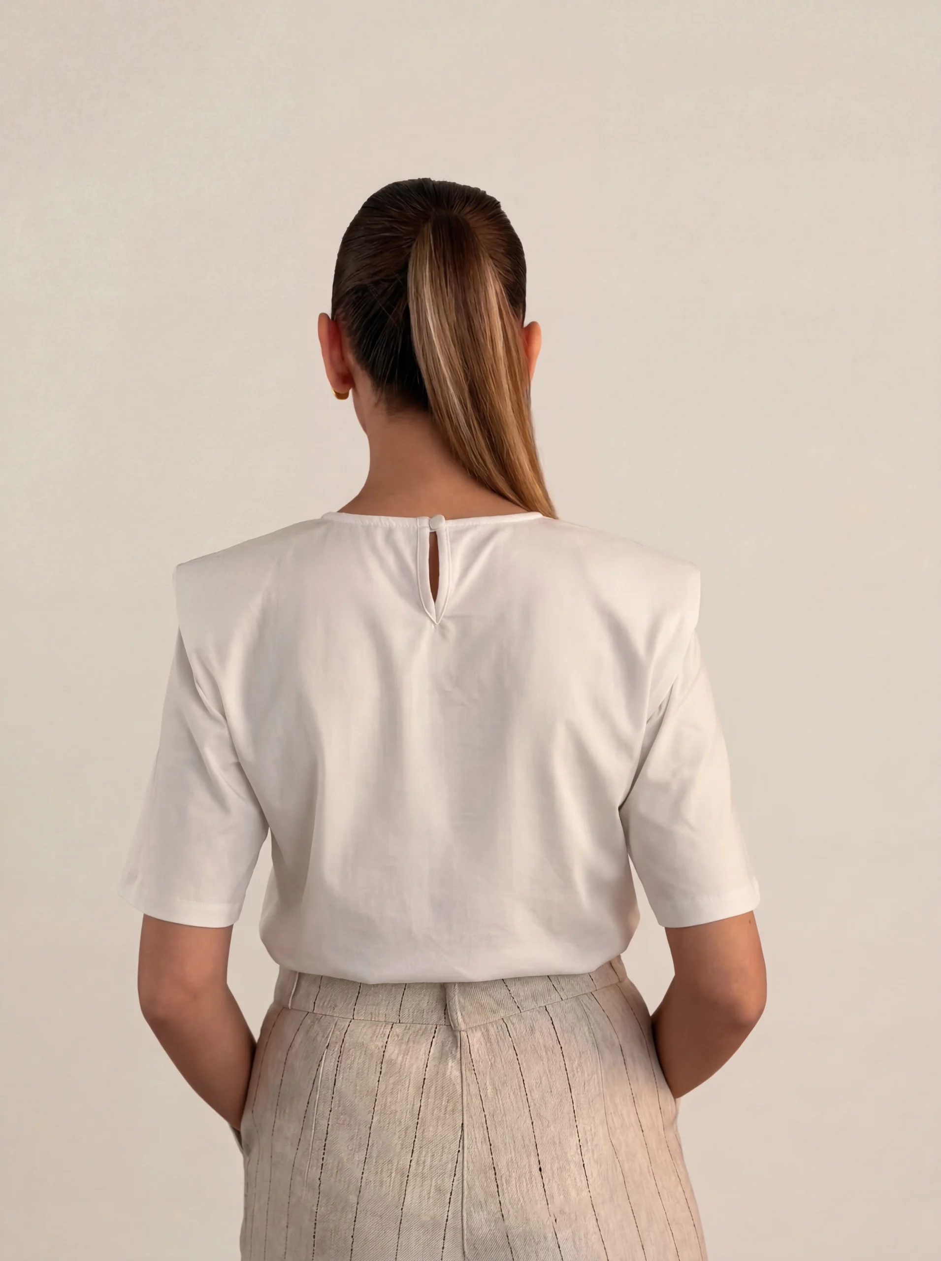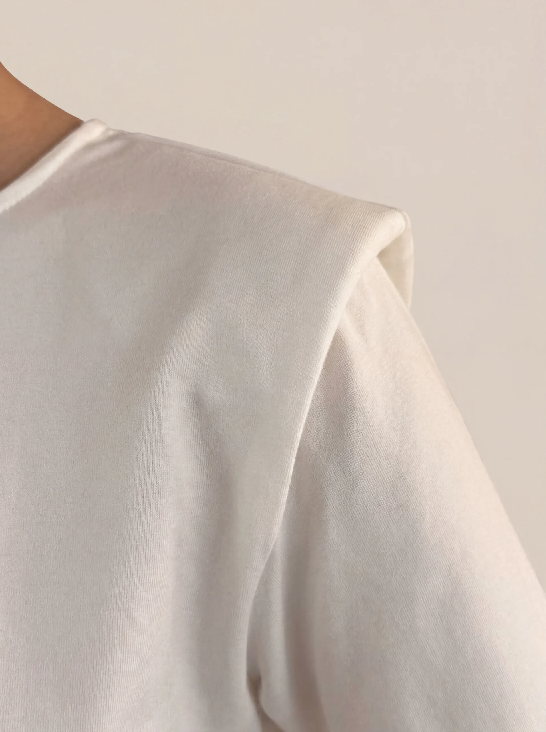 Forme to minimalistyczny t-shirt wykonany z miękkiej dzianiny bawełnianej z dodatkiem elastanu, która zapewnia komfort i dopasowanie do sylwetki. Klasyczny krój został uzupełniony o poduszki na ramionach, które nadają sylwetce bardziej wyrazistą linię i subtelną strukturę.