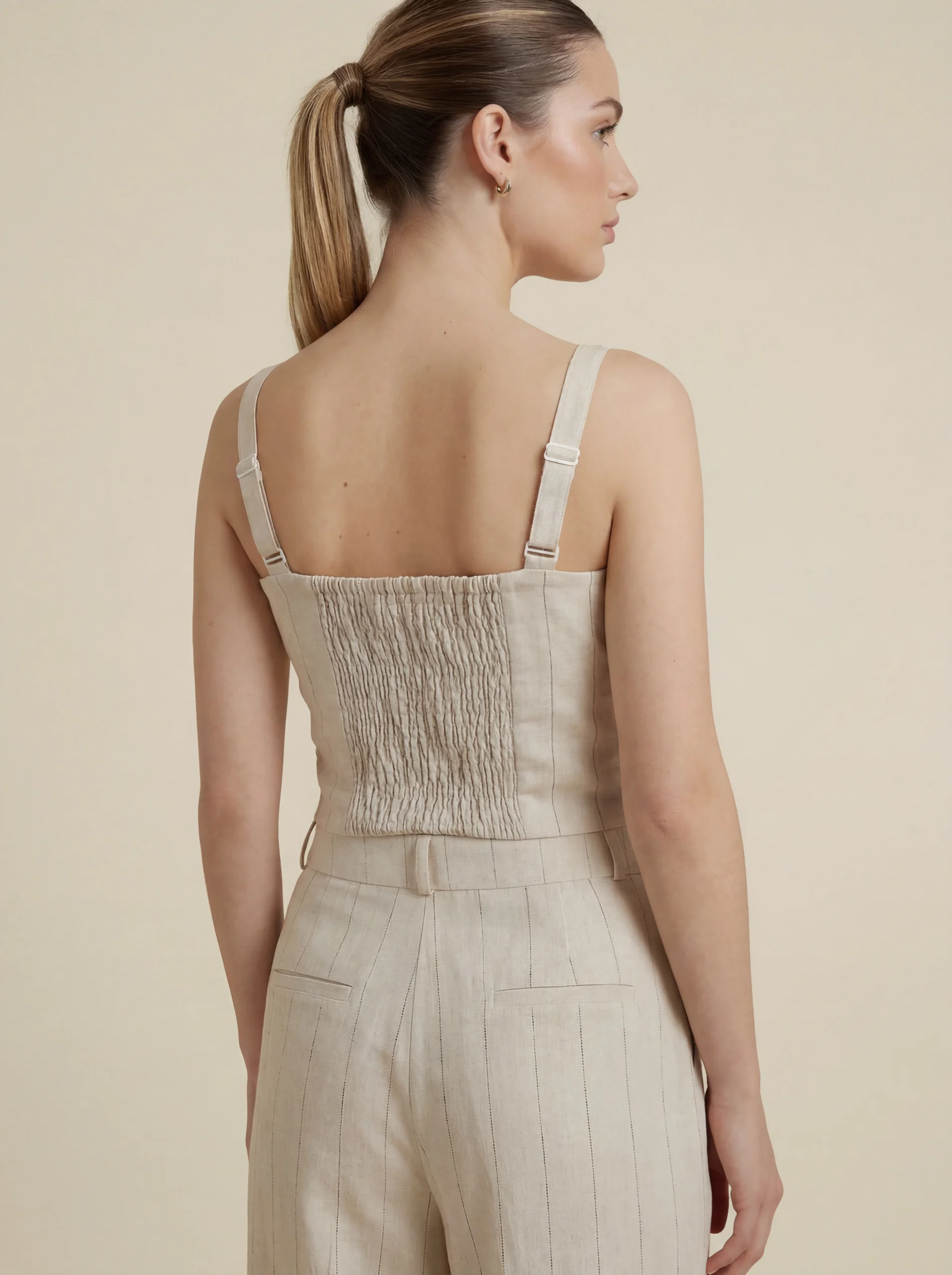 Top Ligne to krótki top do pępka, który łączy nowoczesną formę z elegancją inspirowaną krojem marynarki. Szerokie ramiączka i lekko wyprofilowany dekolt podkreślają linię ramion oraz biustu, a pionowy prążek – identyczny jak w sukience Ligne – optycznie wydłuża sylwetkę i nadaje całości eleganckiego charakteru.