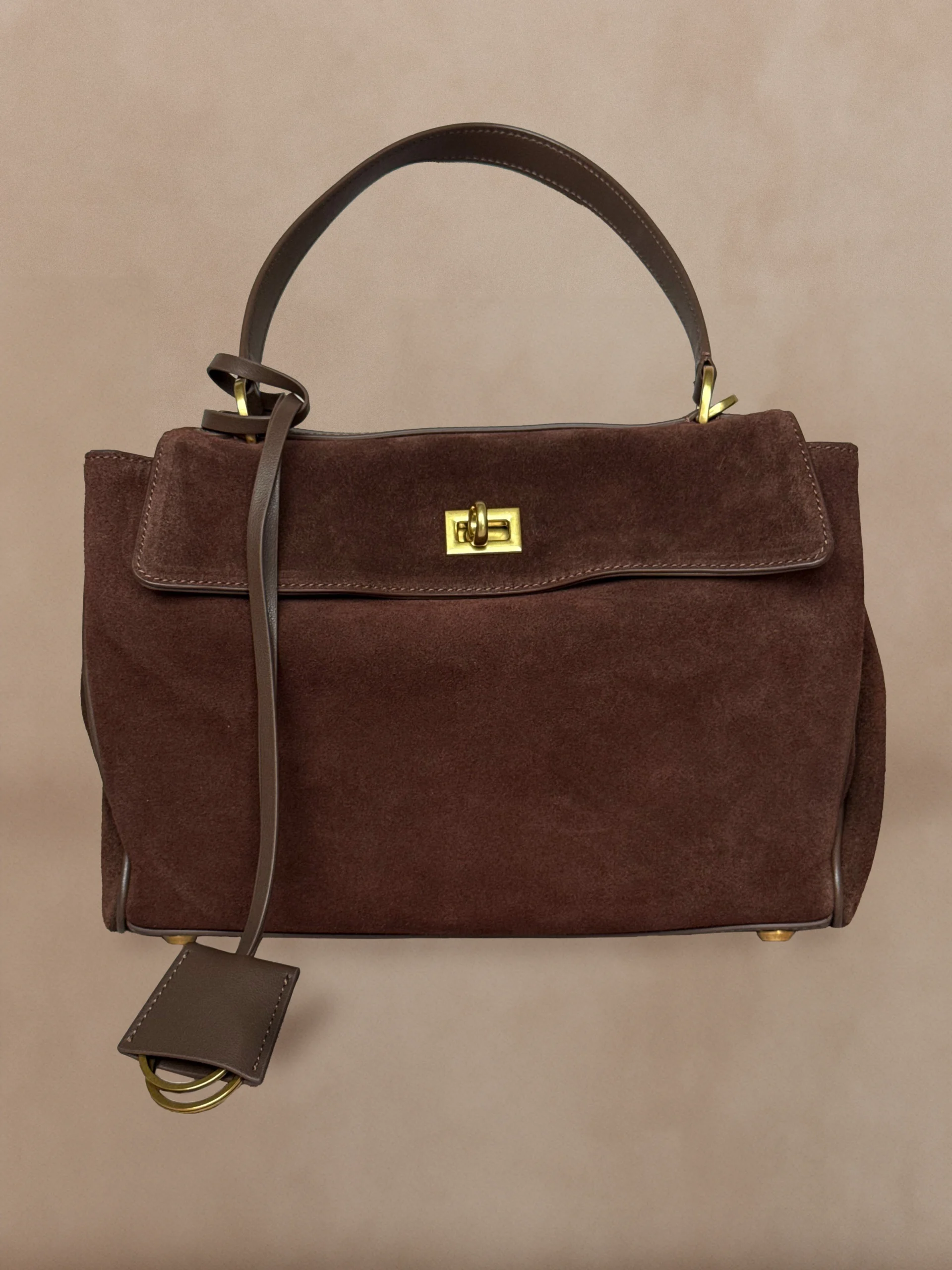 Été to zamszowa torebka w odcieniu czekoladowego brązu, która łączy elegancję z codzienną funkcjonalnością. Obrotowe zapięcie, okucia w kolorze starego złota i klasyczny kształt nadają jej ponadczasowego uroku. Dzięki dodatkowym kieszeniom i paskowi na ramię to model, który sprawdzi się w każdej sytuacji.
